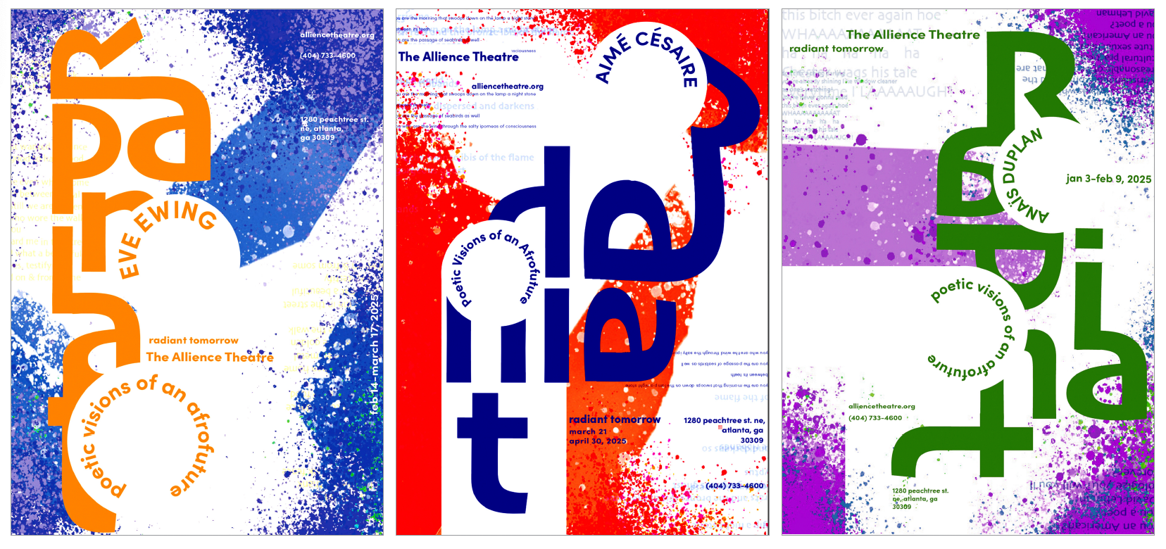 The creation of a poster series exploring Radiant Tomorrow: Poetic Visions of an Afrofuture. Through the thoughtful use of typography and imagery, the series visually interprets the authors’ works, highlighting how their visions of the future intersect, inspire, and resonate. Each poster is designed to complement the others compositionally, forming a cohesive narrative that celebrates Afrofuturist creativity and imagination.